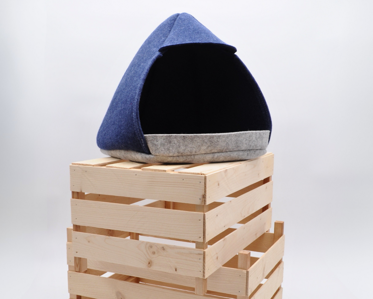 Ein Rückzugsort für Katzen – gefertigt aus 100% Merino-Wollfilz in tiefem Indigo-Blau mit grauen Akzenten. Gemütlich für deinen Stubentiger, ein markantes Design Statement für dein Zuhause.